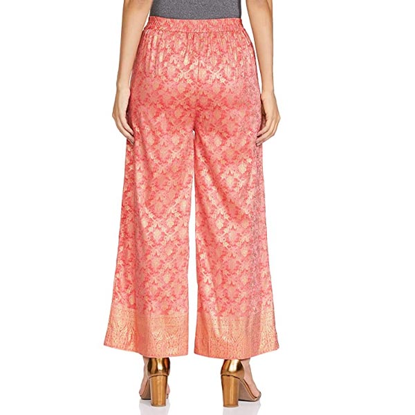 - Pink coloured straight palazzos with ornamental foil print detail and elasticated waistband.