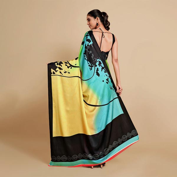 Lime Green & Blue Satin Saree