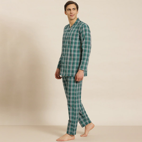 Men Green & White Checked Cotton Night suit