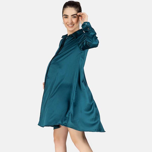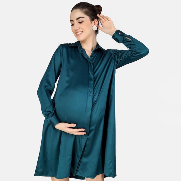 Green Satin Maternity Shirt Dress