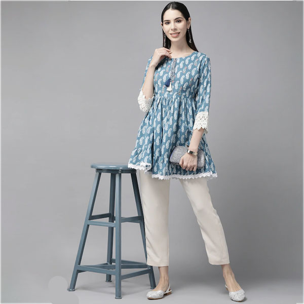 Women Blue & White Paisley Print Tunic with Lace Detail