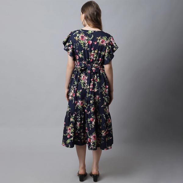 Women Navy Blue Floral Crepe Maternity A-Line Midi Dress